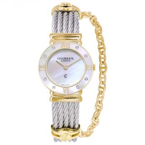 Take a sun-kissed trip to the French Riviera with our much-loved ST-TROPEZ® watch collection. Delightfully feminine, this pretty Swiss-made quartz timepiece features our signature braided cable motif on the strap, alongside an additional chain bracelet to add a unique jewelry accent to the design. Full of elegance and sophistication, it is crafted in yellow gold plating and stainless steel with a white mother-of-pearl dial, decorated with diamonds. A quintessential ladies' watch, epitomizing Charriol’s artistry and style. The size can be adjusted to find the perfect fit and the strap features a hypoallergenic finish.