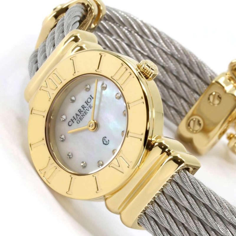 Take a sun-kissed trip to the French Riviera with our much-loved ST-TROPEZ® watch collection. Delightfully feminine, this pretty Swiss-made quartz timepiece features our signature braided cable motif on the strap, alongside an additional chain bracelet to add a unique jewelry accent to the design. Full of elegance and sophistication, it is crafted in yellow gold plating and stainless steel with a white mother-of-pearl dial. A quintessential ladies' watch, epitomizing Charriol’s artistry and style. The size can be adjusted to find the perfect fit and the strap features a hypoallergenic finish.