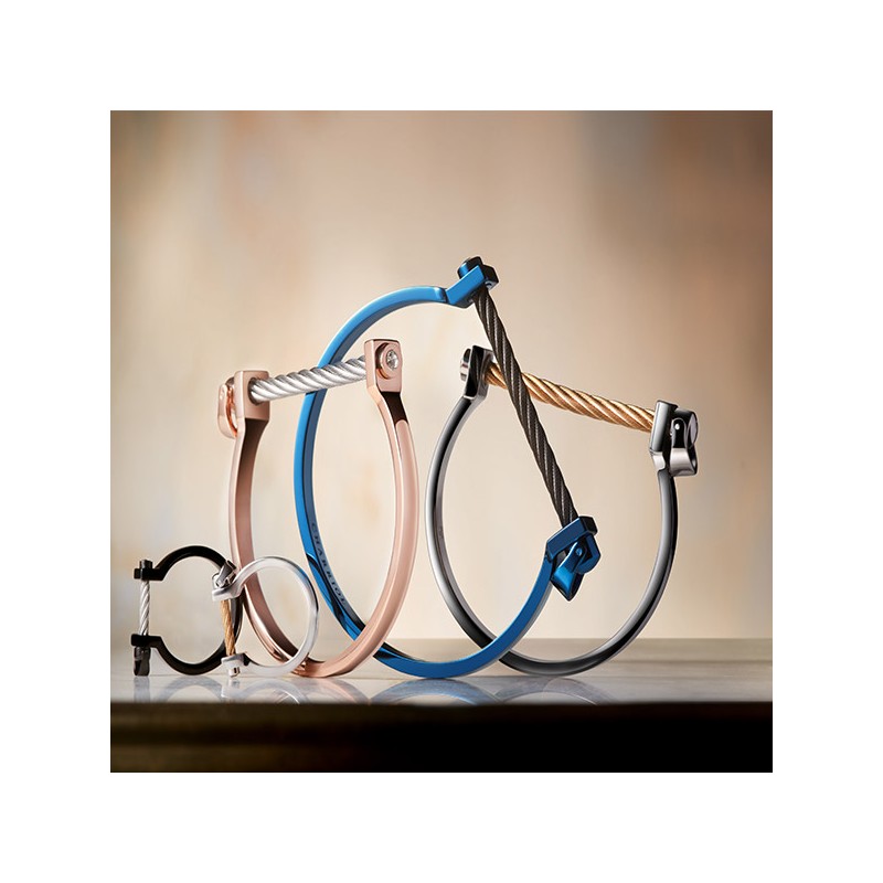 The pieces in this contemporary collection blend polished metals with the texture of Charriol’s twisted cable motif. Available in blue, black stainless steel or rose or yellow gold PVD, the steel cable latched between the ends can be unscrewed. The U-shaped clevis is a pleasing little design detail.
