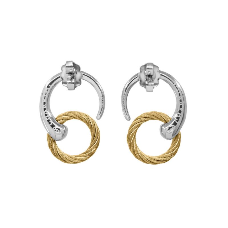 As deceptively effortless as a Japanese garden, this stunning pair of pierced earrings is perfect for those who delight in simple pleasures and value quiet fulfillment and peace. Perfectly balanced and proportioned, the fresh and elegant hinged design features a tapering steel circle and a loop of our iconic woven steel cable in yellow gold PVD decorated with white topaz details. Showcasing Charriols artistry at its best, you'll wear them again and again.