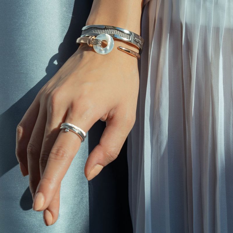 As deceptively effortless as a Japanese garden, this stunning bangle is perfect for those who delight in simple pleasures and value quiet fulfillment and peace. Perfectly balanced and proportioned, the fresh and elegant hinged design features a tapering pink gold PVD circle, a loop of our iconic woven steel cable, and a smoothly-crafted circle of white mother of pearl. Showcasing Charriols artistry at its best, this tactile and feminine piece is a bangle to treasure.