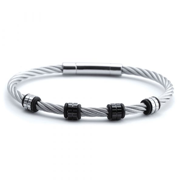 Express your difference with this both ethnical and fashion bracelet, coming from the northern countries and in the meantime in tune with the urban trends. Elect this 4mm stainless steel cable torque decorated with geometric designed black PVD and steel pearls to give an up-to-date density to your wildness and your masculine dimension. Twist your gestures and style with this Celtic touch imbued of Charriol's "art of living the difference". And dare offer you an added value of modernity and uniqueness by stackling them around your wrist.