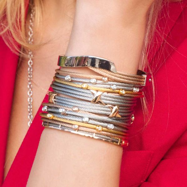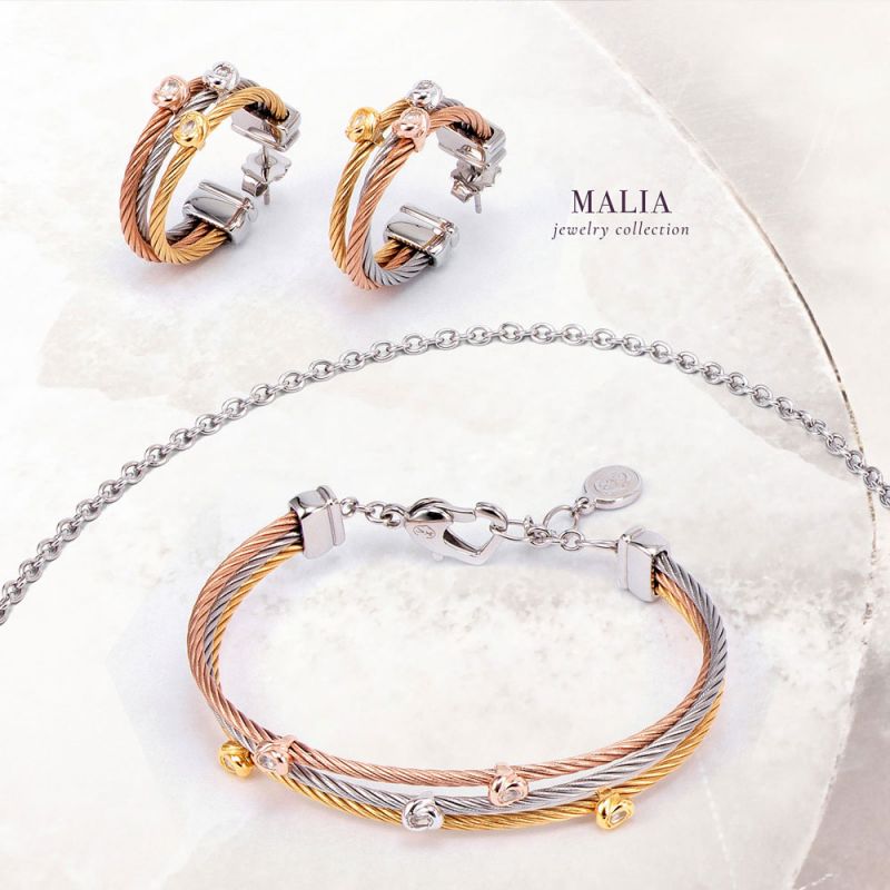 5 delicate flowers match with the 3 color cables that signs this Malia ring. Mounted on a 2mm steel cables, it skillfully combines the symbolic fragility and elegance of white topaz with the strength of silver and steel. All youthful and happy creations, the necklace, bracelet, ring and half hoop earrings are the ideal accessories to add to an ever-fashionable floral outfit.
