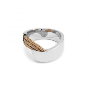 A stainless steel ring with rose gold PVD cables of 1.5mm section. The incomparable appeal of the Shoreline collection owes much to its assertive proportions in the form of an asymmetrical open ring that is closed by 3 colored steel cables. This unisex ring is available in sizes S to XXL (50 to 64).