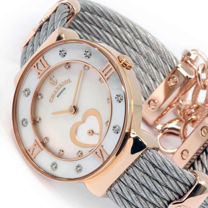 The hallmark of each ST-TROPEZ™ watch bracelet is its open-ended bangle design. Each watch bracelet, embellished with a pair of décors clips, comes attached with a unique ST-TROPEZ™ chain bracelet, finished with a security chain and clasp. All CHARRIOL cables are produced in Switzerland, with an exclusive stainless steel and titanium alloy, in the La Chaux-de-Fonds workshops. They are treated with hypoallergenic finish under a strict production process, also used in the medical field, and meet the ASTM International A967-01 standards.
