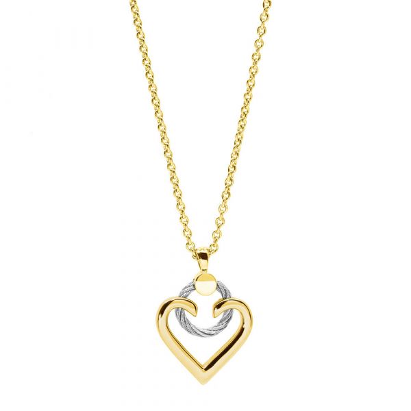 A yellow gold double chain necklace with a split heart connected by a 1.5 mm steel cable ring. The yellow gold plated silver chain - on which the 18 mm by 18 mm heart motif slides - can be fixed in 3 different lengths from 40 cm to 45 cm with a 3-link locking system. The Touch collection honors the power of a simple gesture, that of our 5th sense, touch.