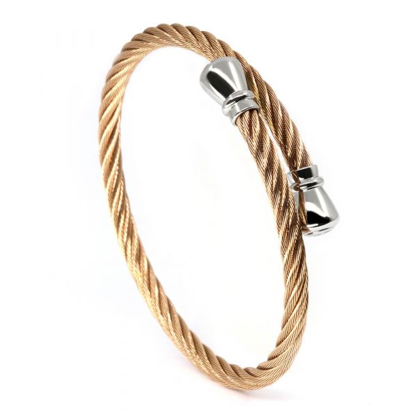 Celtic Bangle - Rose Gold PVD stainless steel 4mm cable with stainless steel endcaps. Freely inspired by the Celtic "torque" adornments and composed of cables, its twists and turns define the unique Charriol style. The 4mm diameter cable makes this bangle an ideal unisex jewelry piece and perfect for gifting.