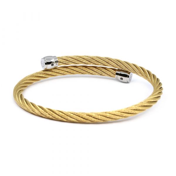 Charriol's iconic woven cable - made in hypoallergenic stainless steel and titanium, is formed into an overlapping yellow gold PVD cable bangle, ended by stainless steel caps. Contemporary and stylish, this timeless bangle is available in 5 sizes and can be adjusted to find the perfect fit and match various two tones Celtic rings and earrings.