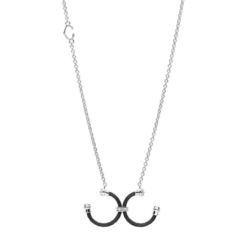 "An exclusive pendant (40mm by 20mm) with double open circle in silver and steel. The back-to-back cables are made of 1.5mm diameter black PVD steel and adorned with silver end pieces set with white topaz. ""C de Charriol CHARMING"" is part of the ""C de Charriol"" jewelry line that features the brand's logo, a true amulet and symbol of 4 decades of innovation, craftsmanship and design. The silver chain can be fixed in 3 different lengths from 34 cm to 39 cm with a 3-link locking system."
