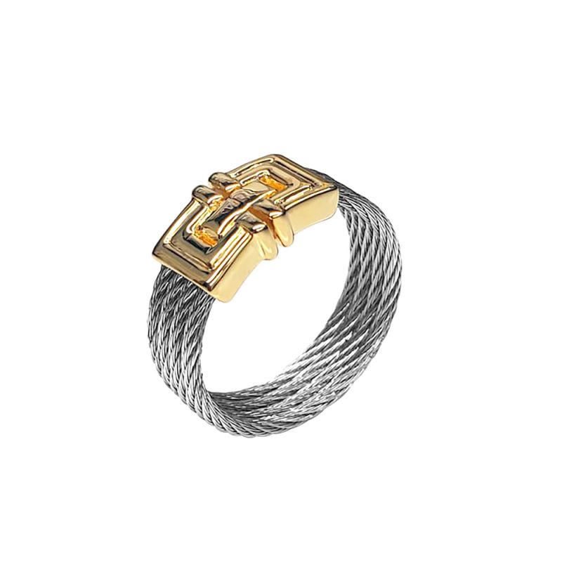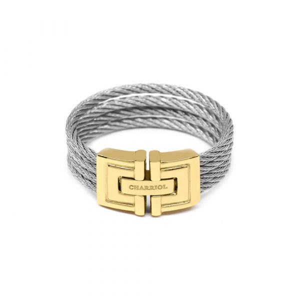 A contemporary rectangular design in yellow gold PVD steel mounted on 4 thin steel cables of 1.5 mm. The Biarritz ring is inspired by the grand palaces and elegant casino architecture for which Biarritz, a sumptuous seaside resort, is renowned throughout Europe. For centuries, a dazzling mix of the highest echelon of society - wealthy patrons, famous artists and European royalty - have frequented the elegant coastline fortified by these magnificent structures and its tawny beaches.