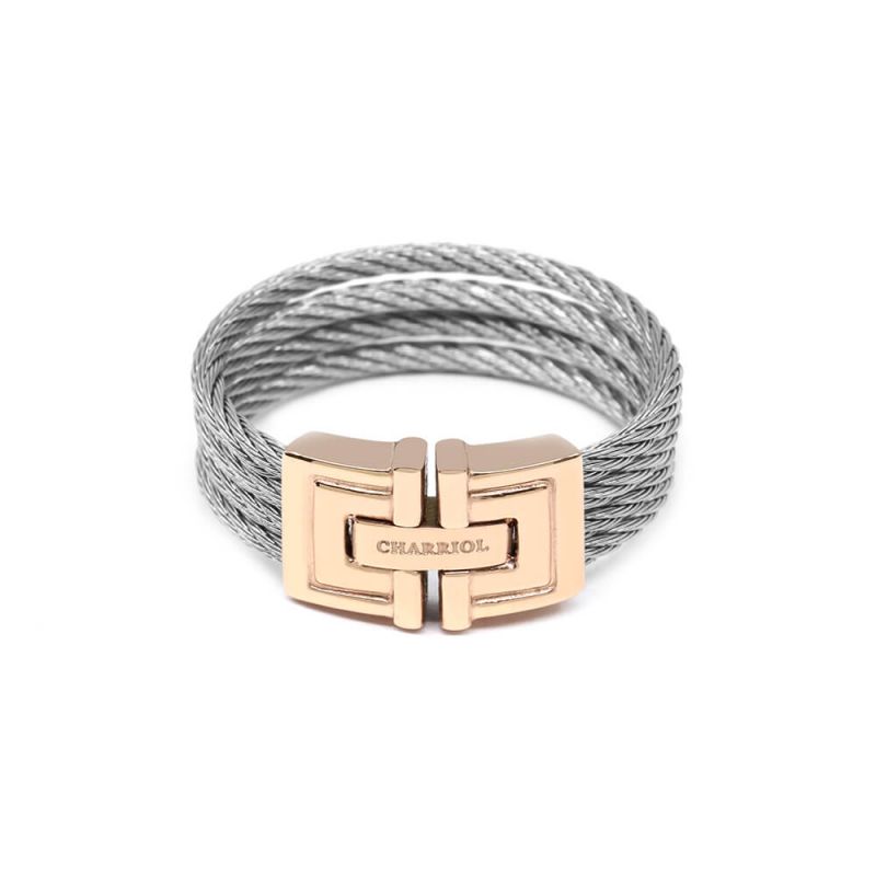 A contemporary rectangular design in rose gold PVD steel mounted on 4 thin steel cables of 1.5 mm. The Biarritz ring is inspired by the grand palaces and elegant casino architecture for which Biarritz, a sumptuous seaside resort, is renowned throughout Europe. For centuries, a dazzling mix of the highest echelon of society - wealthy patrons, famous artists and European royalty - have frequented the elegant coastline fortified by these magnificent structures and its tawny beaches.