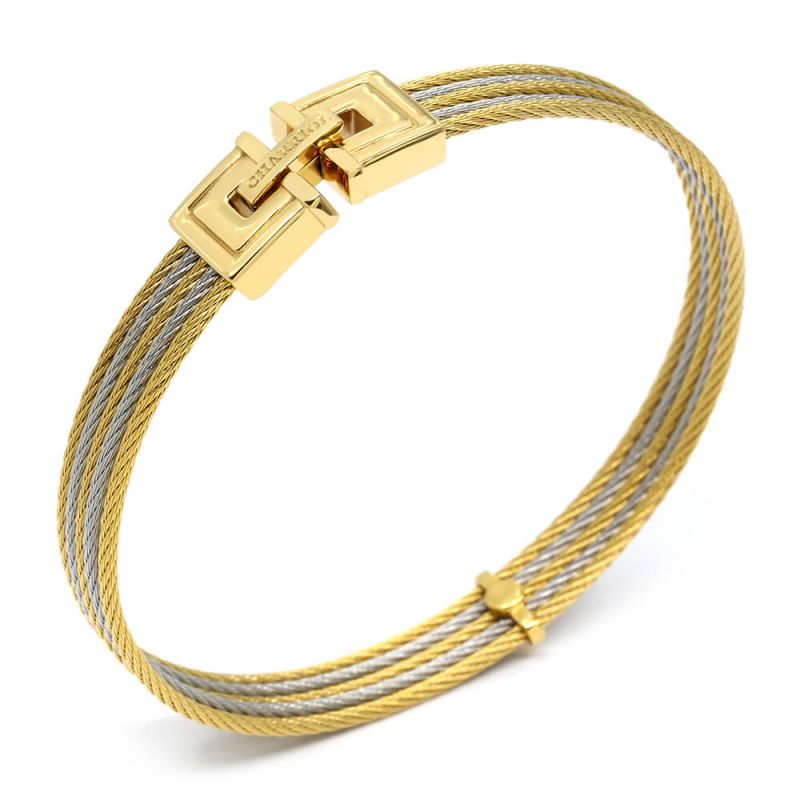 A bangle juxtaposing five 1.5mm twisted cables in steel and yellow gold PVD finishes and linked by an original rectangular decoration discreetly integrating its clasp in yellow gold PVD steel. The Biarritz bangle is inspired by the grand palaces and elegant casino architecture for which Biarritz, a sumptuous seaside resort, is renowned throughout Europe. For centuries, a dazzling mix of the highest echelon of society - wealthy patrons, famous artists and European royalty - have frequented the elegant coastline fortified by these magnificent structures and its tawny beaches.
