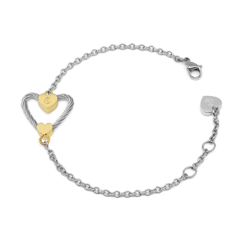 An 18mm wide heart-shaped piece of jewelry, consisting of 2 heart-shaped patterns in yellow gold PVD steel connected by 2 strands of steel cables, is highlighted on a soft steel bracelet. For her and for him, the bracelet fits sizes S to L (15.5cm to 17.5cm).