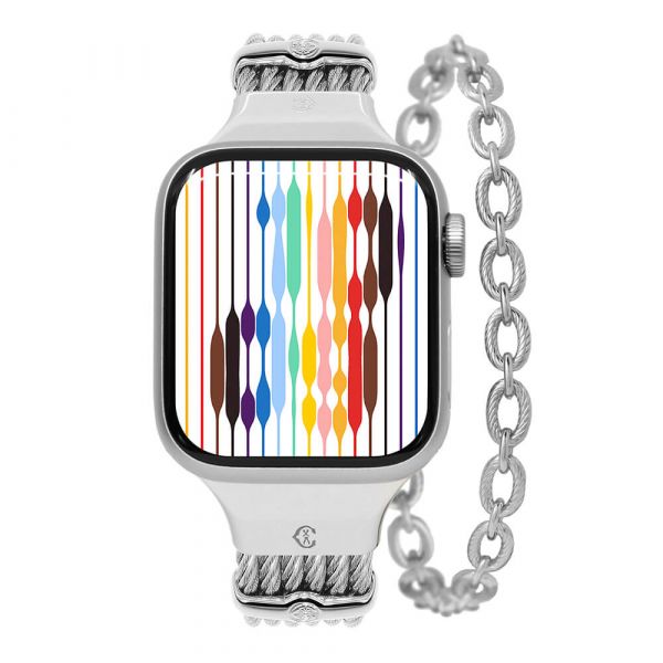 Add a delightful feminine touch to your smart watch with this unique bracelet made of 6 stainless steel cables 2mm, decorated with 2 openwork steel elements and a fine chain with safety clasp. Official sliding attaches will fit all Apple Series 3 (case 38mm), Series SE/4/5/6 (case 40mm), Series 7 (case 41mm) and Series 8 models. Introducing Charriol’s Apple Watch bands, our classic twisted cable updated for a modern, digital age.
