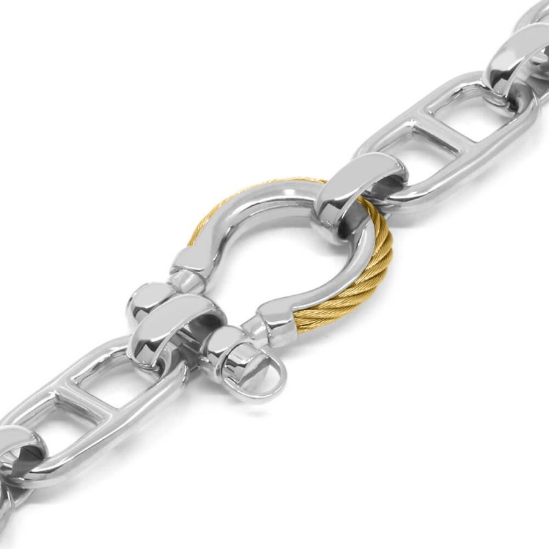 Stainless steel bracelet with yellow gold PVD steel cable. This flexible bracelet is composed of 2 types of exclusive links from the St-Tropez Mariner collection, the oversized marine chain link and the oversized shackle link. The central element is a steel and steel cable shackle with dimensions 25.5mm * 20mm * 4mm. Two oval shaped clasp links allow you to adjust the length to fit wrists ranging from 16cm to 19cm.