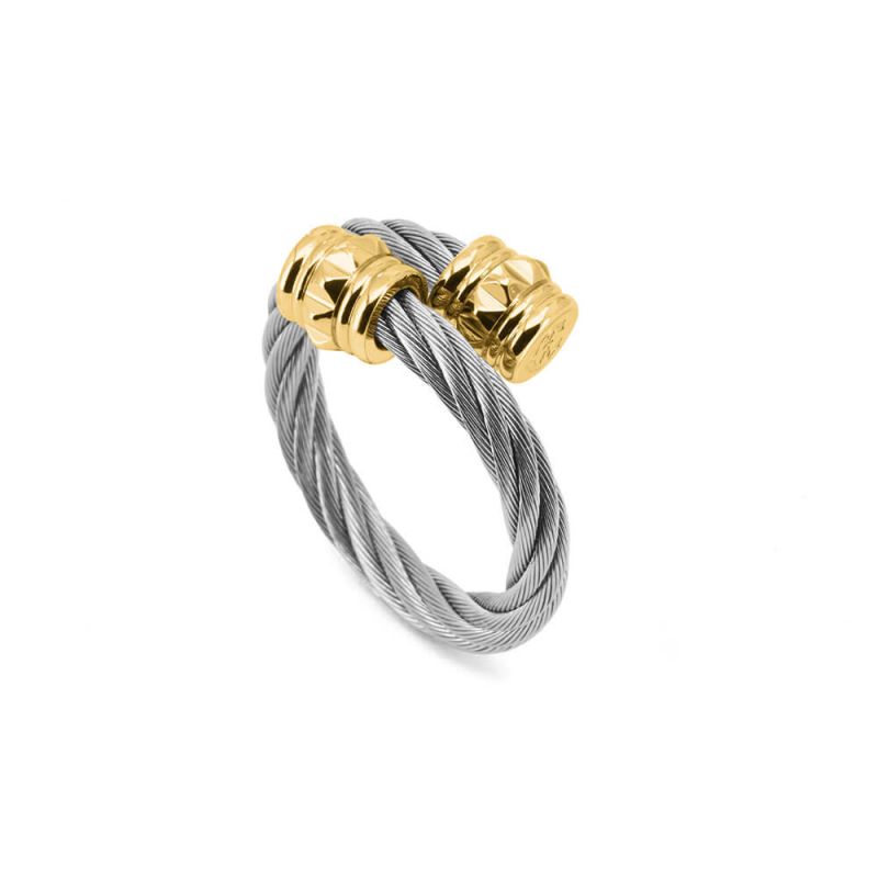 A ring made of 3mm stainless steel cable and yellow PVD decors with an air of punk irreverence. Cylindrical, 4.6mm diameter corrugated end caps are punctured with matching studs that add textural intrigue to a beloved design.