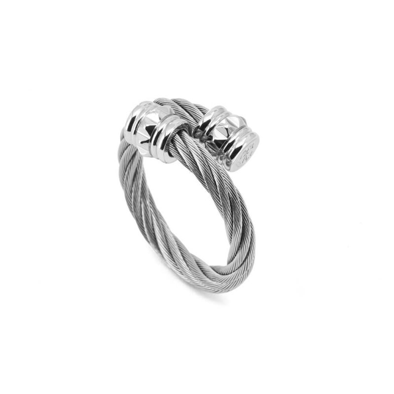 An all steel ring made of 3mm stainless steel cable with an air of punk irreverence. Cylindrical, 4.6mm diameter corrugated end caps are punctured with matching studs that add textural intrigue to a beloved design.