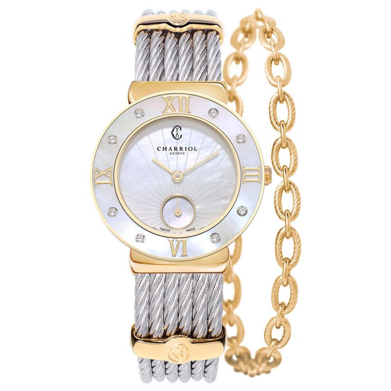 Take a sun-kissed trip to the French Riviera with our much-loved ST-TROPEZ® watch collection. Delightfully feminine, this pretty Swiss-made quartz timepiece features our signature braided cable motif on the strap, alongside an additional chain bracelet to add a unique jewelry accent to the design. Full of elegance and sophistication, it is crafted in yellow gold plating and stainless steel with a white sunburst mother-of-pearl dial and diamond embellishment A quintessential ladies' watch, epitomizing Charriol’s artistry and style. The size can be adjusted to find the perfect fit and the strap features a hypoallergenic finish.
