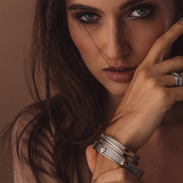 Opt for subtle style with luxurious detailing in this distinctive thin bangle from Charriol’s ever-popular FOREVER collection. Taking inspiration from the shape of a couturier’s bobbin, two fine lines of our signature steel cable are framed by a design in polished rose gold plating. Proudly displaying the brand’s insignia, it showcases our world-renowned craftsmanship with aplomb.