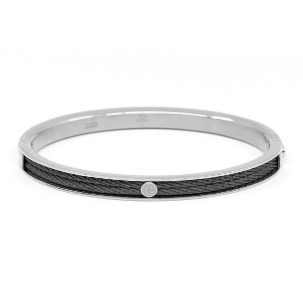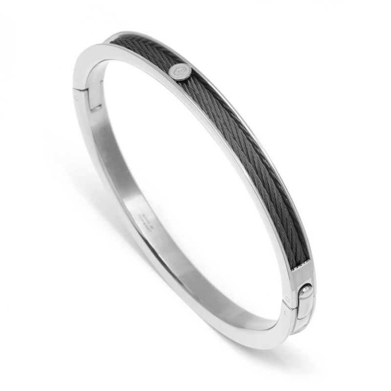 Opt for subtle style with luxurious detailing in this distinctive thin bangle from Charriol’s ever-popular FOREVER collection. Taking inspiration from the shape of a couturier’s bobbin, two fine lines of our signature steel cable, colored in black, are framed by a polished stainless steel edge. Proudly displaying the brand’s insignia, it showcases our world-renowned craftsmanship with aplomb.
