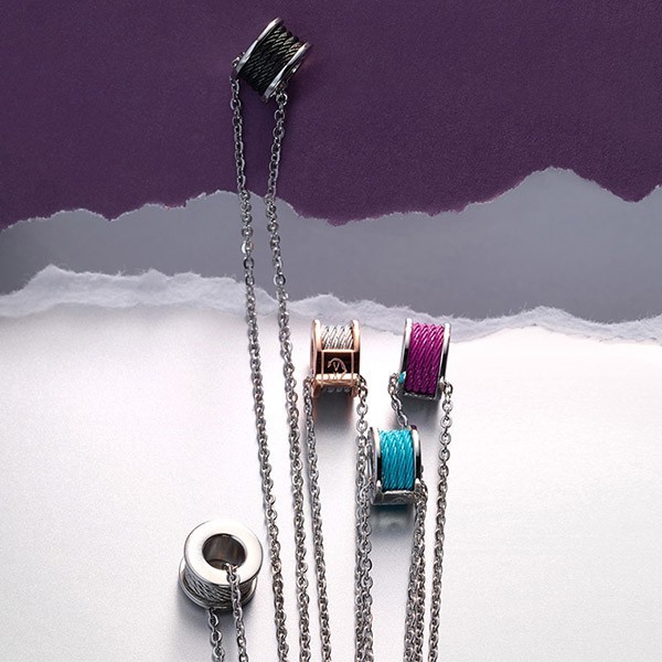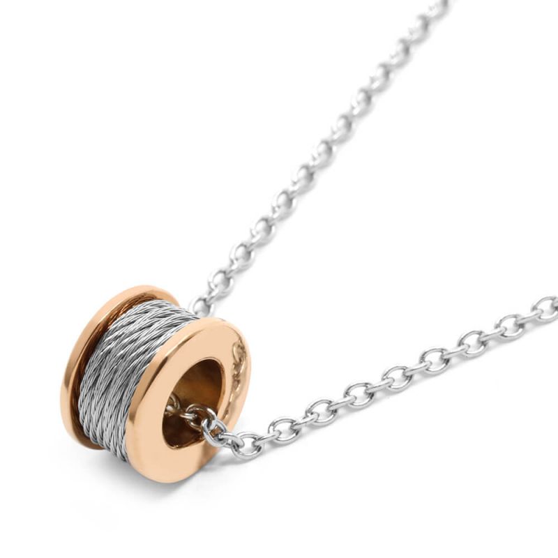 This stunning necklace from Charriol’s bestselling FOREVER collection showcases our iconic woven stainless steel cabling. Designed to bring a touch of subtle glamour to any look, it features a barrel-shaped lozenge, inspired by the shape of a couturier’s bobbin. Four ultra-fine lines of our signature cable are framed by a polished rose gold PVD edge and accented with the brand’s insignia. A modern Swiss-made design, epitomizing our world-renowned craftsmanship and luxurious detailing.