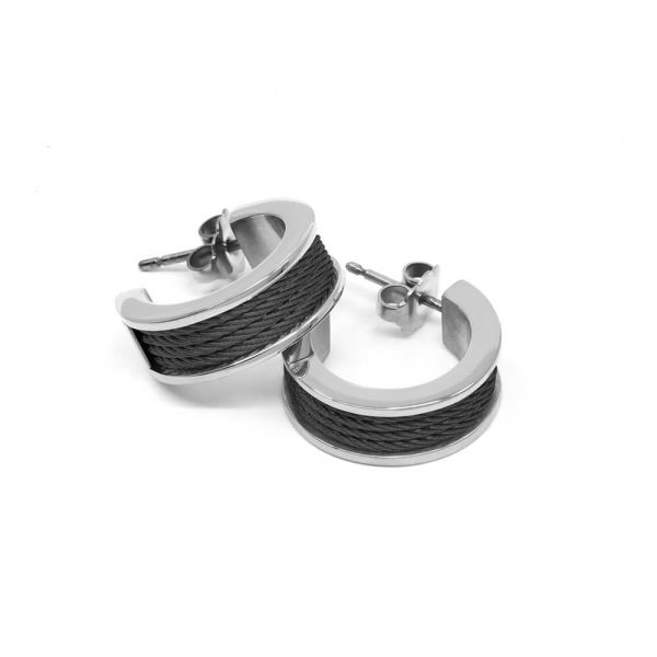 Inspired by the shape of a couturier’s bobbin, four ultra-fine lines of our signature steel cable, colored in black, are framed by a polished stainless steel edge.