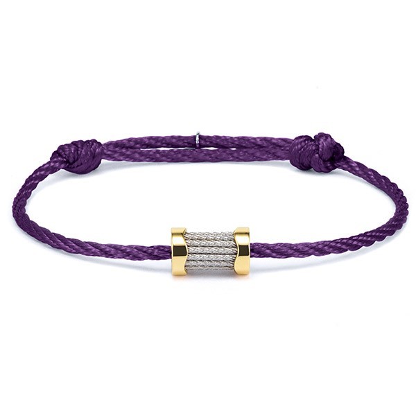 An elegant and understated new keepsake joins our ever-popular FOREVER collection. This ultra-modern purple corded rope bracelet is finished with a yellow gold-plated barrel charm, decorated with our iconic steel cable. The organic shaping is inspired by the curling and arching of sea waves. Ideal for everyday, it will be especially appreciated by those who are water signs of the zodiac - Pisces, Scorpio, and Cancer - or those with a love of the ocean. Universally appealing and epitomizing Charriol’s quality craftsmanship, it’s a wearable and stylish accessory.