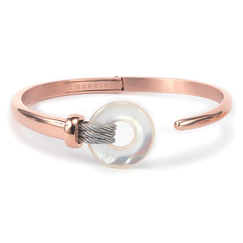 As deceptively effortless as a Japanese garden, this stunning bangle is perfect for those who delight in simple pleasures and value quiet fulfillment and peace. Perfectly balanced and proportioned, the fresh and elegant hinged design features a tapering pink gold PVD circle, a loop of our iconic woven steel cable, and a smoothly-crafted circle of white mother of pearl. Showcasing Charriols artistry at its best, this tactile and feminine piece is a bangle to treasure.