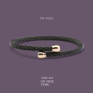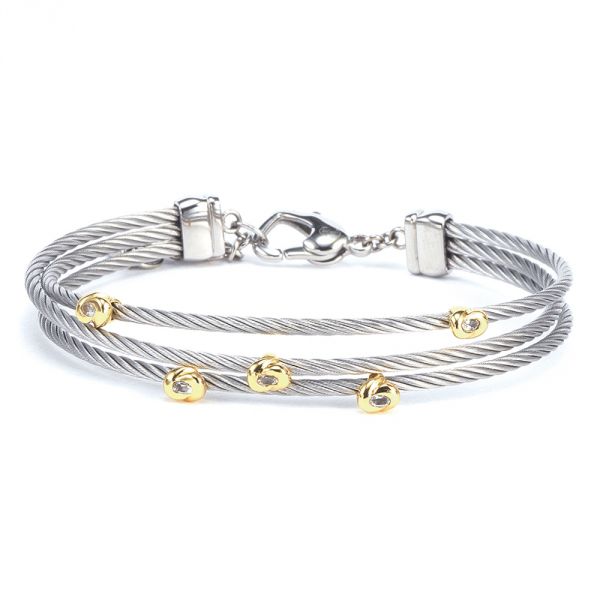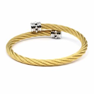 This stunning and ornate yellow gold-plated silver bangle features our signature stainless steel twisted cables strung together and decorated with organic circle motifs. Five precious white topaz stones sparkle throughout the design, making it come alive with youthful femininity. Mimic the fashion-forward stacked effect in luxurious style.
