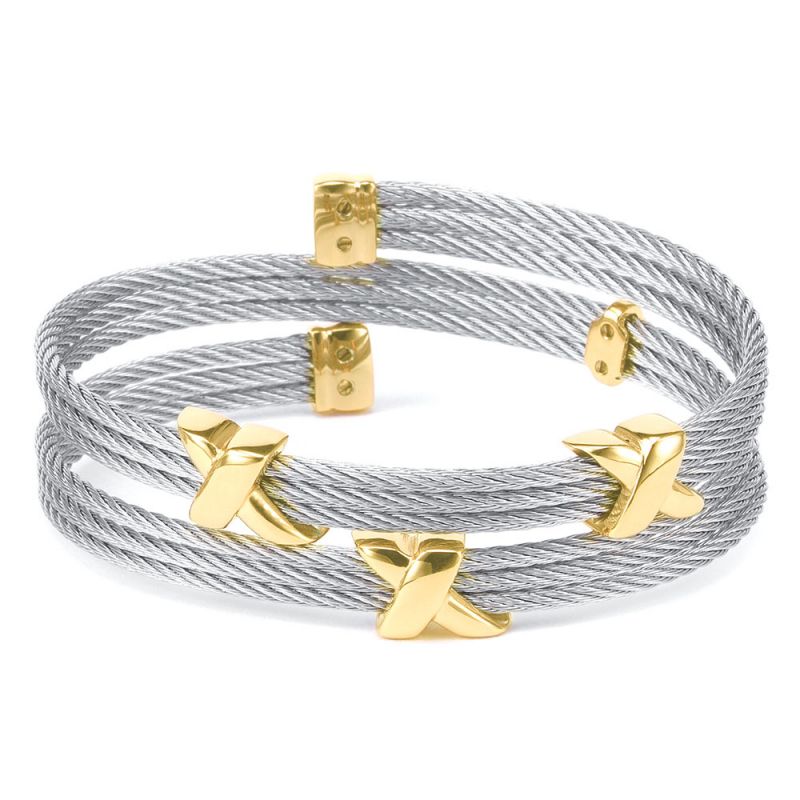 This new TWIST Ivy stainless steel bangle with its assertive femininity is inspired by the symbolism of the fidelity and immortality of ivy, perfectly "linked" to nature. Unattached, a distinctive 3 cables (2mm) bangle wraps around the wrist of a double turn in perfect freedom and comfort. Its 35 centimeters long with a spectacular mineral sylph line is decorated with 4 graphic and poetic stainless steel yellow Gold PVD cross symbols. A wild and original jewel, imbued with a singular sense of aestheticism and original design to express the Charriol woman’s beautiful and intense nature.