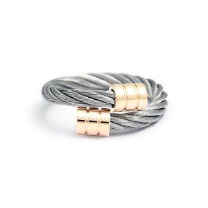 A signature design from Art Director Coralie Charriol-Paul, this elegant ring is a modern reworking of a Celtic torque. Our iconic woven cable in hypoallergenic stainless steel and titanium is formed into an open-shank silhouette, punctuated with highly-polished rose gold-plated end pieces. Contemporary and stylish, this timeless ring can be adjusted to find the perfect fit.