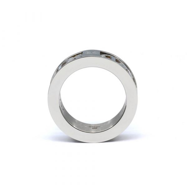 Inspired by the shape of a couturier’s bobbin, four copper PVD steel cable 1.5mm are framed by a polished stainless steel edge. The curves of the stylized anchor chain seem to intertwine with the steel cables while creating an amazing contrast of colors. Available in sizes S/50 to XXL/64, this unisex ring can also be worn from a chain for a more contemporary style.