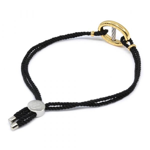 A trendy and refreshing bracelet inspired by the maritime world and its evocative shapes. A stylized anchor chain is finely worked in sterling silver and plated in yellow gold. An additional 2.5mm stainless steel cable underlines its Charriol identity. Like a mooring rope, a black string completes the resolutely modern and unisex spirit of this jewelry piece.