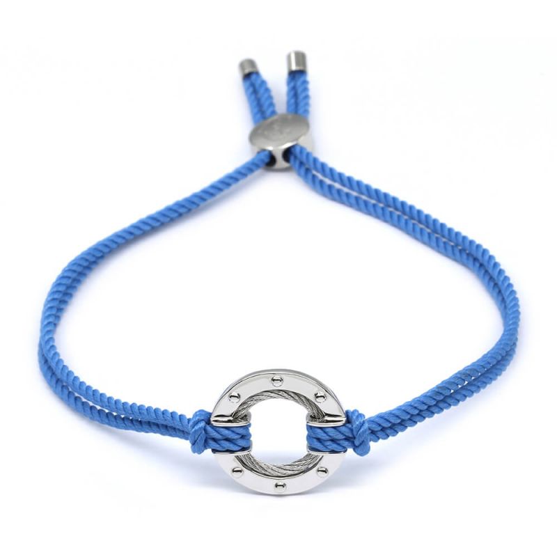 A trendy and refreshing bracelet inspired by the maritime world and its evocative shapes. A stylized porthole is finely worked in sterling silver and completed by a 1.5mm stainless steel cable circle. Like a mooring rope, a blue string completes the resolutely modern and unisex spirit of this jewelry piece.