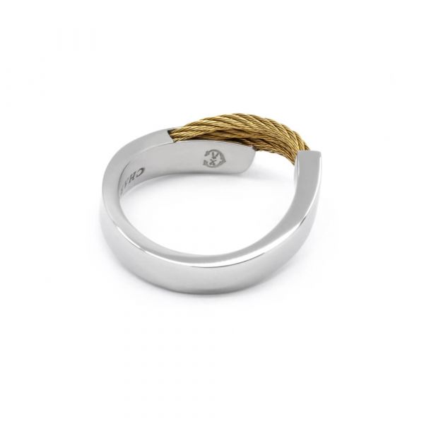 A stainless steel ring with yellow gold PVD cables of 2mm section. The incomparable appeal of the Shoreline collection owes much to its assertive proportions in the form of an asymmetrical open ring that is closed by 3 colored steel cables. This unisex ring is available in sizes S to XXL (50 to 64).