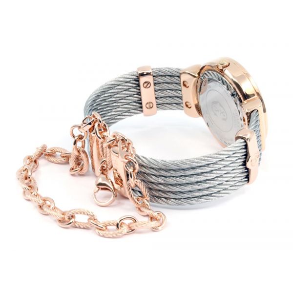 The hallmark of each ST-TROPEZ™ watch bracelet is its open-ended bangle design. Each watch bracelet, embellished with a pair of décors clips, comes attached with a unique ST-TROPEZ™ chain bracelet, finished with a security chain and clasp. All CHARRIOL cables are produced in Switzerland, with an exclusive stainless steel and titanium alloy, in the La Chaux-de-Fonds workshops. They are treated with hypoallergenic finish under a strict production process, also used in the medical field, and meet the ASTM International A967-01 standards.