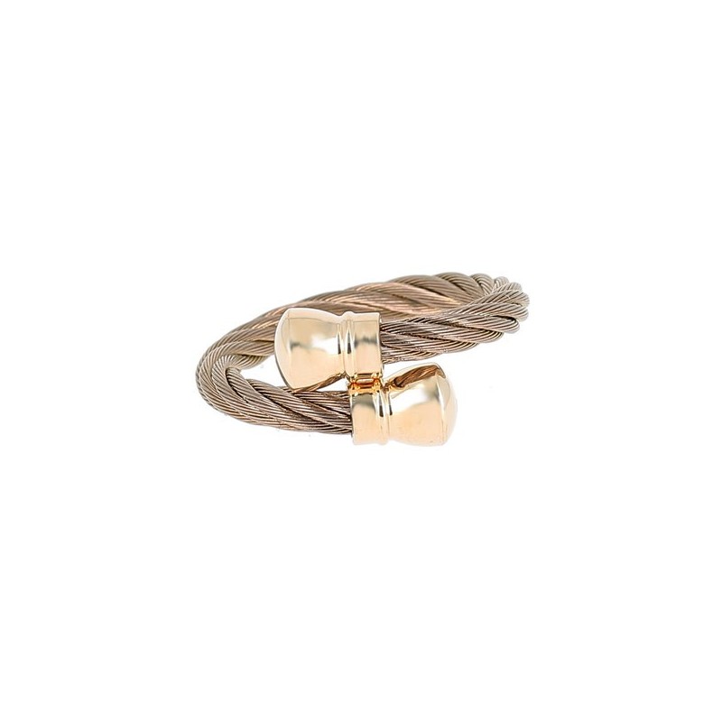 A signature design from Art Director Coralie Charriol-Paul, this elegant ring is a modern reworking of a Celtic torque. Our iconic woven cable in hypoallergenic stainless steel and titanium, colored in bronze, is formed into an open-shank silhouette, punctuated with highly-polished rose gold-plated end pieces. Contemporary and stylish, this timeless ring can be adjusted to find the perfect fit.