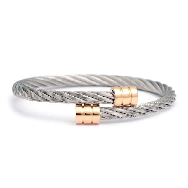 A signature piece from Art Director Coralie Charriol-Paul, this elegant bangle is a modern reworking of a Celtic torque. Our iconic woven cable in hypoallergenic stainless steel and titanium is formed into a unisex open-shank design, punctuated with polished rose gold-plated end pieces. Contemporary and stylish, this timeless piece can be adjusted to find the perfect fit.