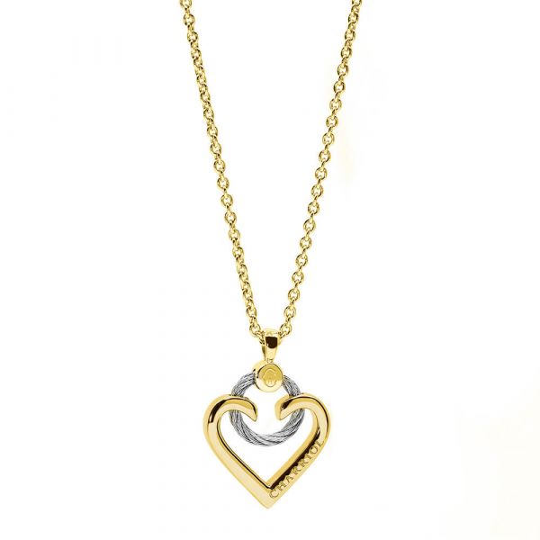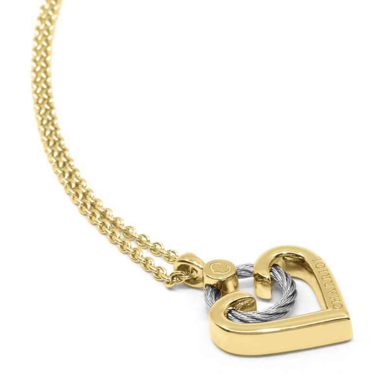 A yellow gold double chain necklace with a split heart connected by a 1.5 mm steel cable ring. The yellow gold plated silver chain - on which the 18 mm by 18 mm heart motif slides - can be fixed in 3 different lengths from 40 cm to 45 cm with a 3-link locking system. The Touch collection honors the power of a simple gesture, that of our 5th sense, touch.