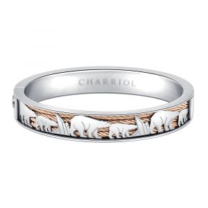 Forever Polar Bear Bangle - Rose gold PVD steel cables nestled in a stainless steel bracelet and decorated with the stylised outline of a mother and her polar bear cub in an ice field. The Polar Bear piece is the newest iteration of the Forever Animal Collection, launched in 2017 as a symbolic and ethical gesture to spotlight the increasing scarcity of animals on our planet through evocative and figurative designs.