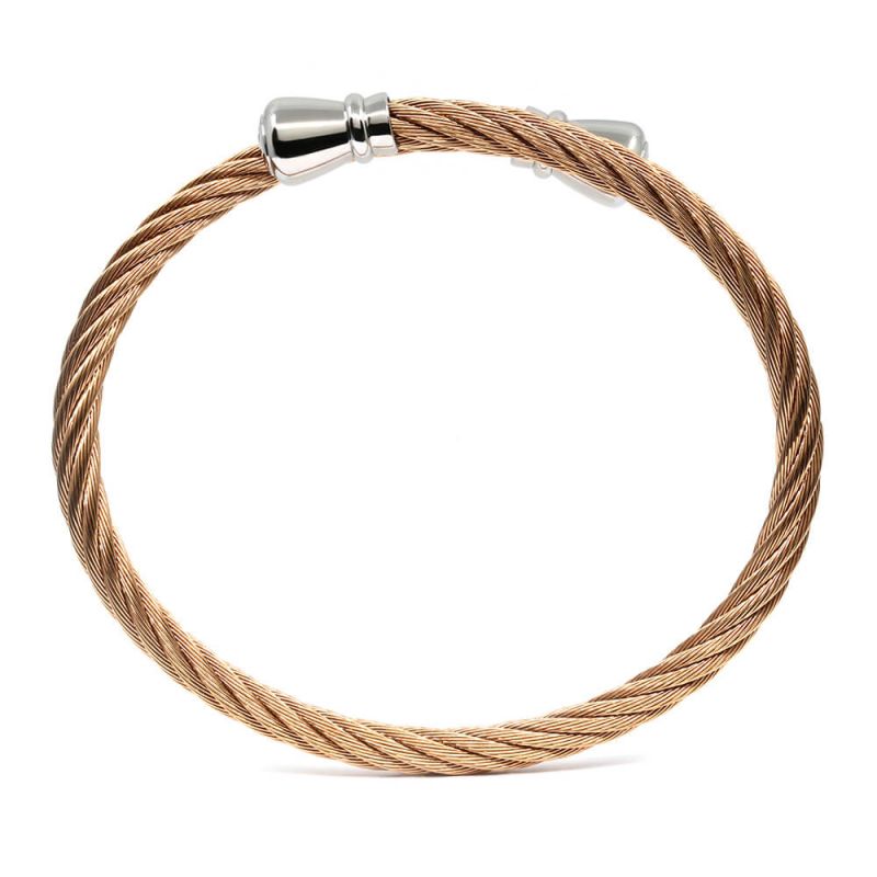 Celtic Bangle - Rose Gold PVD stainless steel 4mm cable with stainless steel endcaps. Freely inspired by the Celtic "torque" adornments and composed of cables, its twists and turns define the unique Charriol style. The 4mm diameter cable makes this bangle an ideal unisex jewelry piece and perfect for gifting.