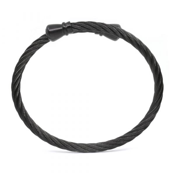 Charriol's iconic woven cable in hypoallergenic stainless steel and titanium, is formed into an overlapping cable bangle, ended by stainless steel caps. A Black PVD treatment of cables and caps gives to this unisex bangle a stricking look. Contemporary and stylish, this piece of jewelry is available in 5 sizes and can be adjusted to find the perfect fit and match your black or colored accessories.