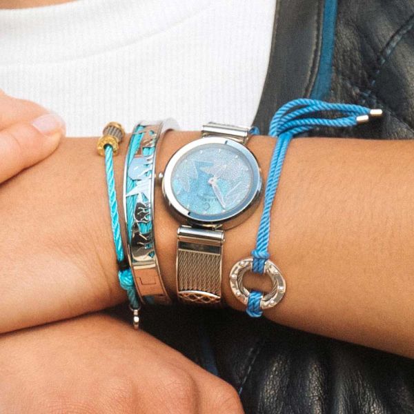 A refreshing Swiss-made watch with a 32mm stainless steel case, blue mother-of-pearl dial and Swiss movement. The Forever Polar Bear watch features a mother and her cub in the shimmering blue majesty of the Arctic. The blue mother-of-pearl dial is offset by 12 diamonds, adding a frosted finish to this sphere of winter beauty.
