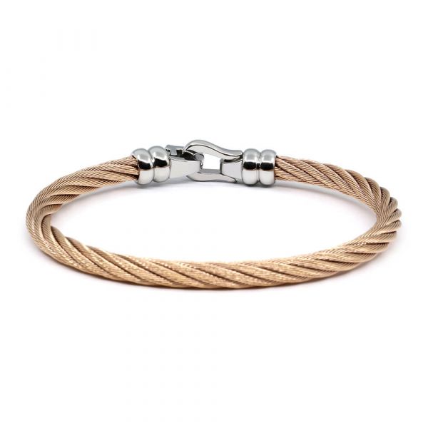 An outstanding rose gold PVD twisted steel cable 5mm featuring a stylish steel hook and eye. Ibiza bangles line was born from the sundrenched isle, Ibiza - a timeless nautical elegance with a drop of balearic sun. Long before a mass of throbbing crowds set a pulsing rhythm on the sundrenched isle, Ibiza was an ancient outpost caught in the crosswinds of maritime activity. The popular destination boasts a long history of seafaring heritage, as Greeks and Romans, Norwegians and Muslims arrived and conquered the sparse island of pines.