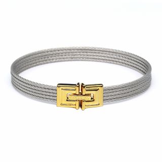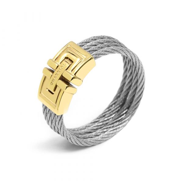 A contemporary rectangular design in yellow gold PVD steel mounted on 4 thin steel cables of 1.5 mm. The Biarritz ring is inspired by the grand palaces and elegant casino architecture for which Biarritz, a sumptuous seaside resort, is renowned throughout Europe. For centuries, a dazzling mix of the highest echelon of society - wealthy patrons, famous artists and European royalty - have frequented the elegant coastline fortified by these magnificent structures and its tawny beaches.