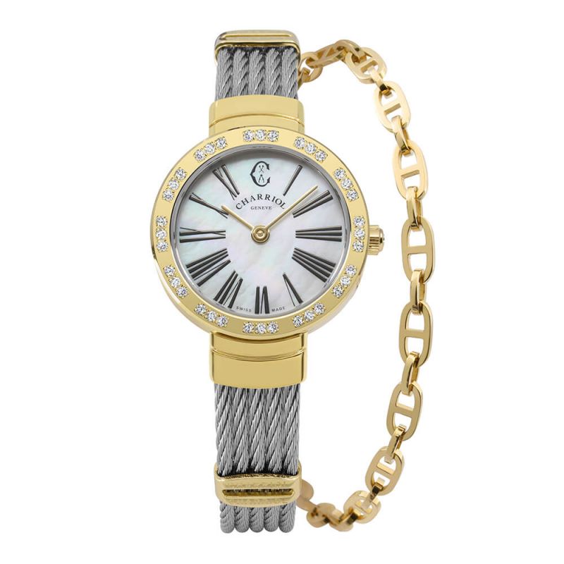 The Swis Made diamonds and yellow gold plated new St-Tropez watch is built on the original 1983 design with a more open dial, thinner bezel and refined bracelet end caps. A 25mm yellow gold plated watch case set with 36 white diamonds 0.27cts and engraved with St-Tropez logo on the side, white mother of pearl dial with 11 classic roman figures, Swiss ETA quartz movement, mounted on a 2mm stainless steel 5 cables bracelet with yellow gold plated openwork oval decorations, chain and safety clasp.