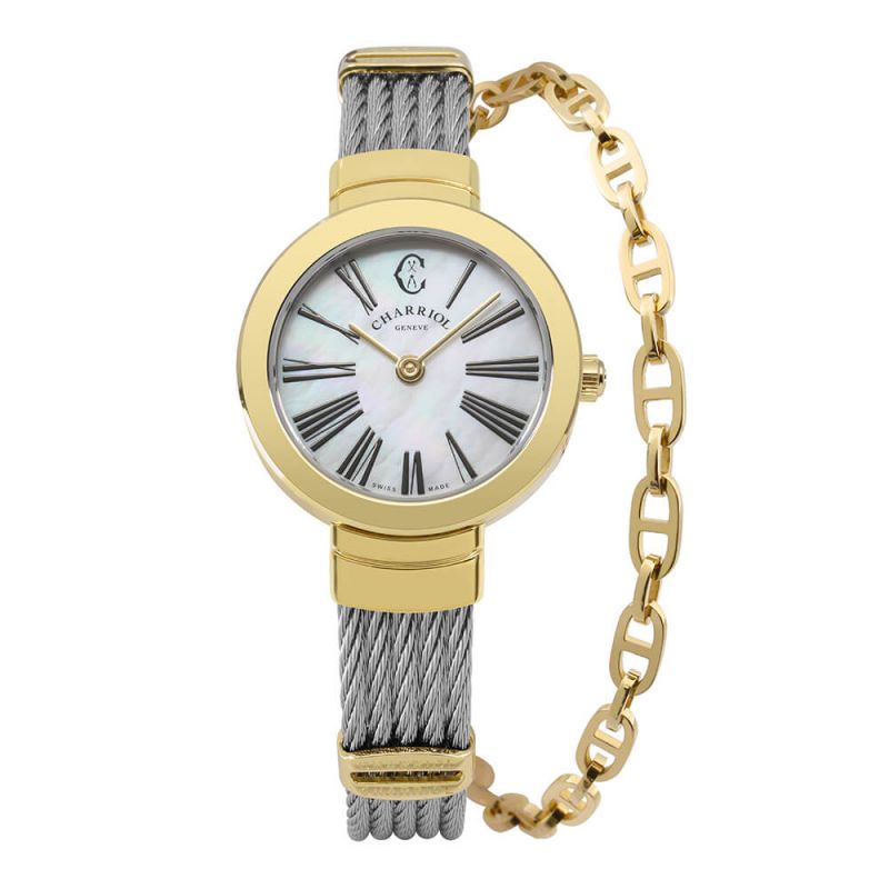 The new yellow gold plated St-Tropez lady's watch is built on the original 1983 design with a more open dial, thinner bezel and refined bracelet end caps. A 25mm yellow gold plated steel watch case with engraved St-Tropez logo on the side, white mother of pearl dial with 11 classic roman figures, Swiss ETA quartz movement, mounted on a 2mm stainless steel 5 cables bracelet with yellow gold plated openwork oval decorations, chain and safety clasp.