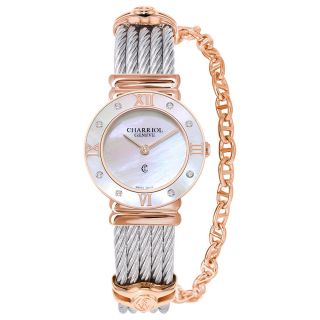 A 25mm stainless steel watch case set with 104 white diamonds 0.41cts and engraved with St-Tropez logo on the side, white mother of pearl dial with 11 classic roman figures, Swiss ETA quartz movement, mounted on a 2mm stainless steel 5 cables bracelet with openwork oval decorations and accompanied by a chain and safety clasp. Since 1983, the trademark of the St-Tropez watch collection is its open cable bracelet with its matching chain, which makes it a true Jewelry Watch, a "Montre-Bijou par excellence".