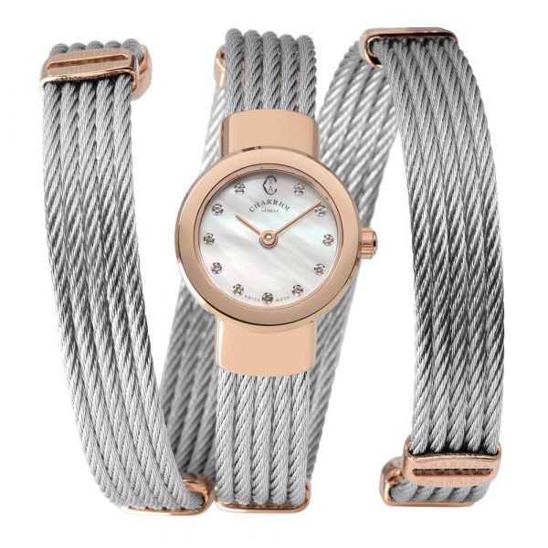 Rose gold plated steel case 20mm, white mother-of-pearl dial with 11 diamonds 0.05cts and Swiss movement. The unique bracelet is composed of 5 stainless steel cables, set with 5 oval and double Charriol engraved décors and 2 rose gold plated end-pieces. This double-twist bracelet, which totalizes 36cm lenght, makes a regal statement.