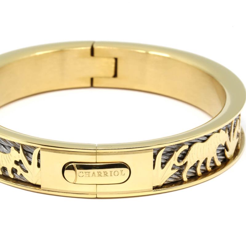 Yellow gold PVD steel hard shape bangle with 4 steel cables. A figurative design features the silhouette of a tiger stalking the jungle, a precocious cub in tow. This yellow gold PVD decor repeats against our signature twisted steel cables.